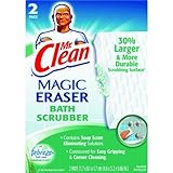 Mr. Clean, 2 Count, Magic Eraser Bath Scrubber, With Foaming Cleanser, Febreze Meadows & Rain Scent, 33% Larger Than Original Eraser, Optimized For Larger Bathroom Cleaning Tasks, Contoured Shape For Easy Gripping & Corner Cleaning, Textured For Tough Cleaning, More Compressed Product For Increased Durability & Strength, Easily Tackles Tough Soap Scum & Build Up, Just Add Water & It Cleans Dirt, Grease, Grime, Crayon, Scuff Marks On Any Hard Surface.